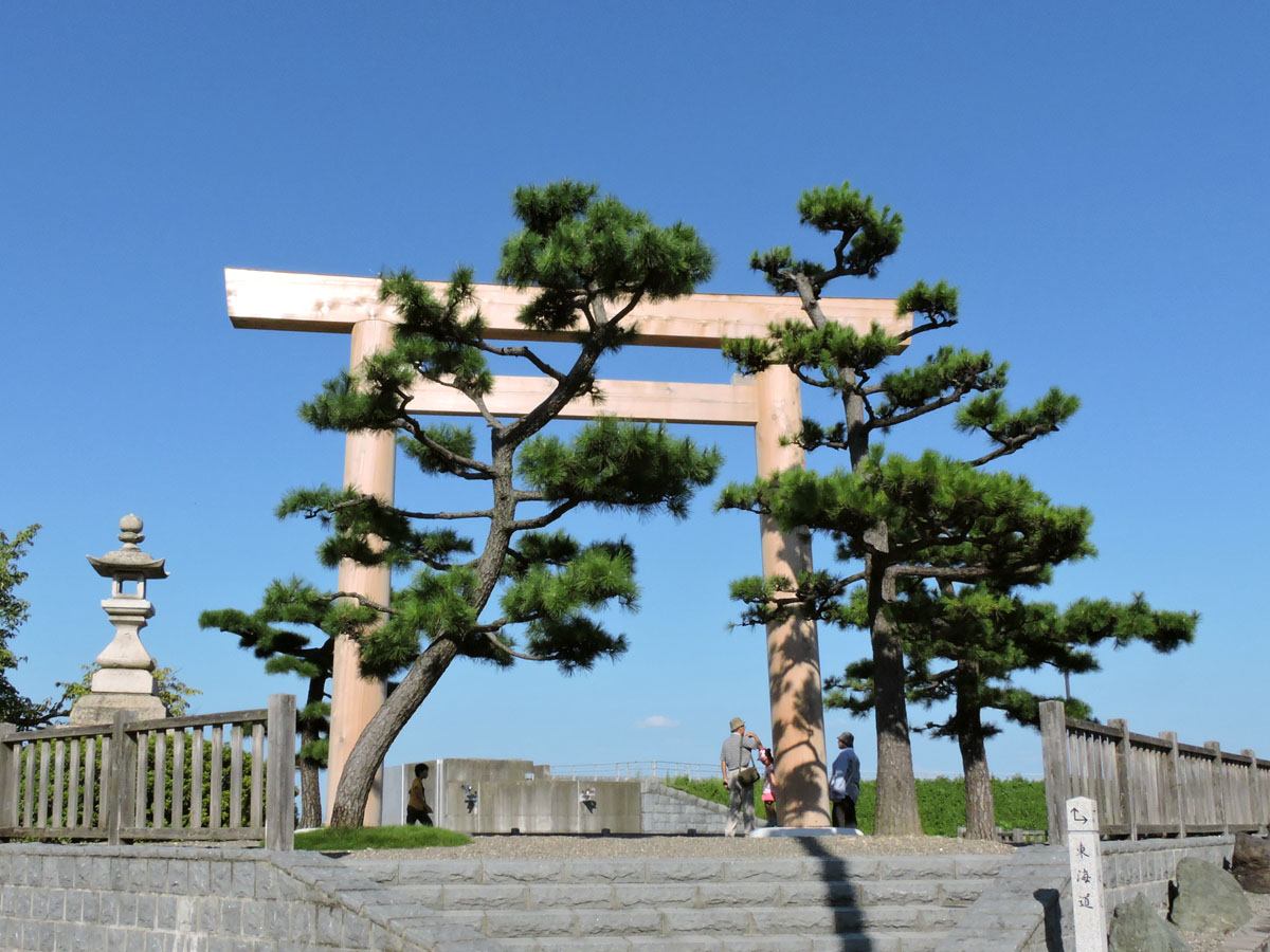 大きな鳥居は「伊勢国一の鳥居」で、伊勢の国の東の玄関口となっています。伊勢神宮・宇治橋外側の鳥居を貰い受けているそうです。式年遷宮での建て替えが2015年6月行われ、9月に訪ねたときに、建て替え間もない鳥居を見ました。