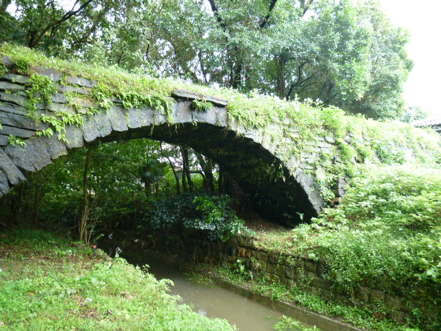 今回、近代化産業遺産と言うことで大牟田市にある一部の施設が世界遺産登録されました。その世界遺産を見学する為に大牟田に来たのですが、大牟田駅前の「大牟田観光プラザザ」で入手した地図にこの「早鐘眼鏡橋」が掲載されてたので行ってきました。干拓して作られた大牟田の三池港付近に水を供給する為に1647年に三池藩によって造られた、石造りのアーチ橋です。今はその機能は果たし終え橋のみ残っていて国の重要文化財として残っています。風格がありますね。ちょっとわかりにくい場所ですが、早鐘眼鏡橋のバス停付近です。