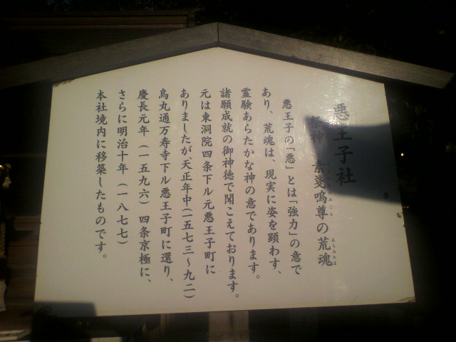 祇園の八坂神社の境内にはいくつか小さな社があります。悪王子社もそのひとつ。東洞院四条下ル元悪王子町→烏丸通万寿寺下ル悪王子町→現在地(明治十年)と移築されたようですが、町名に「悪王子町」が残ってるところがスゴイ!