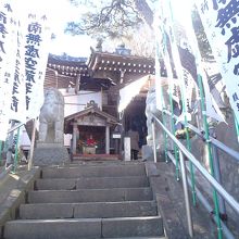 江の島電鉄極楽寺駅から長谷寺方向へ約300mほど、極楽寺切通しを上って下ったあたりの法面に建っていて、のぼりがたくさん立っているので見つけやすいお寺です。