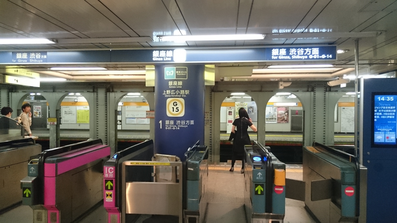 現在の銀座線が開業した1930年からある駅で松坂屋上野店と直結しています。上野駅から500メートル程度しか離れていないのに駅があるのは、地下鉄開業に合わせてライバル三越が、三越前駅を設置することを知り、松坂屋も同様の対応を求めたからとのこと。しかし、既に工事が始まっていたので、デパートと駅が直結する程度になってしまったとのこと。ただし、この駅の広告は松坂屋以外は出すことができない契約とのこと。大江戸線の上野御徒町駅、日比谷線の仲御徒町駅と接続していますが、日比谷線の仲御徒町駅は遠いので、こちらで乗り換えるよりも、上野や銀座で乗り換えた方が近いです。また、JR御徒町駅が近くにあり、京成上野駅までの地下道もあります。銀座、渋谷方面の1番線と、上野、浅草方面の2番線は往き来することができず、トイレも1番線しかありません。