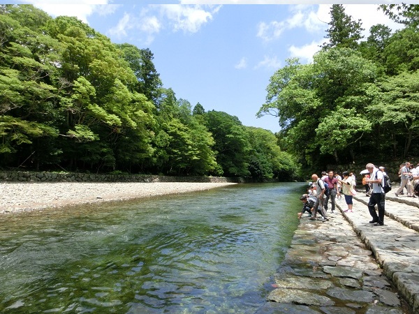 内宮入口にある全長102Mの宇治橋は、高欄つきの和橋で、式年遷宮に先駆け20年ごとに新しく造営されます。綺麗に手入れがされている神のお庭と言われている場所です。昔は神職の方々の住居があったそうです。 第一鳥居・第二鳥居をくぐり少し進み、右手のゆるやかな斜面を下ると御手洗場と呼ばれる五十鈴川にでます。正式にはここから先が聖域になるようです。