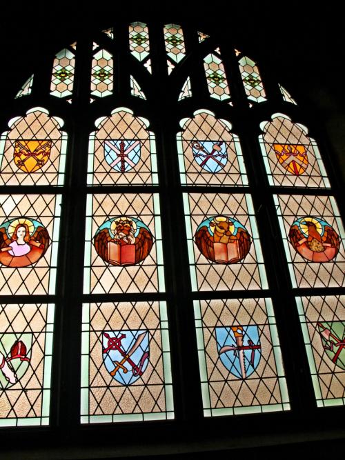 ステンドグラスには、獅子、雄牛、鷲、天使、そして戦いの象徴である剣、鉾、盾の図柄が嵌め込まれている。
