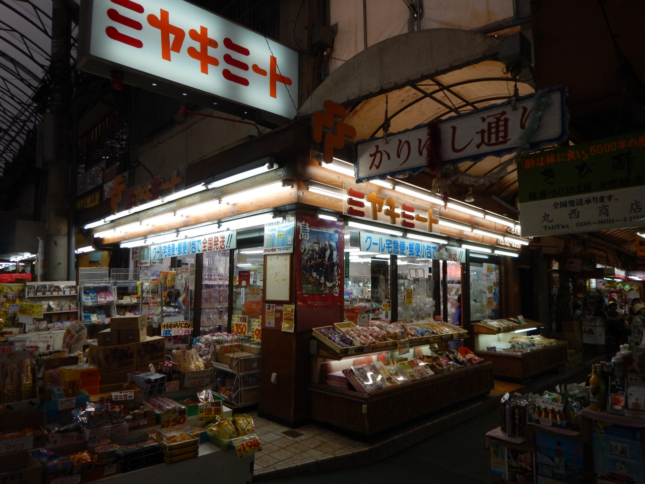 国際通りにあるドンキ ホーテの横の市場本通りを歩いて行くと、第一牧志公設市場がありますが、さらに歩くと琉球銀行があり、その少し先にミヤギミートがあります。店名から肉屋さんかと思いましたが、肉は奥の方に少し置いているだけで、商品のほとんどは土産物でした。