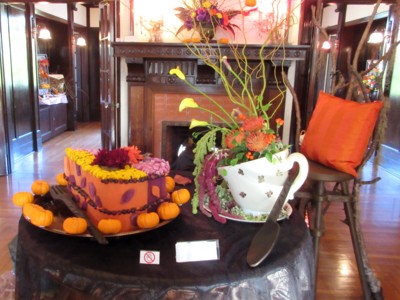 入ってすぐのところに置かれた大きなかぼちゃのケーキとティーカップ。