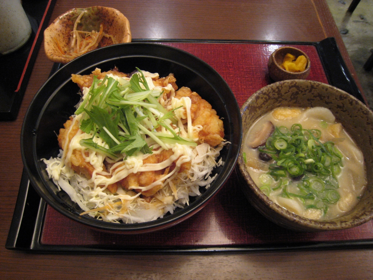 初めて、とり天を食べましたが、やはり唐揚げとは違っていました。丼でしたが、上からかかっているマヨネーズととり天の下のキャベツの細い千切り、そしてたれととても調和がとれていて美味しかったです。団子は手で伸ばすものです。