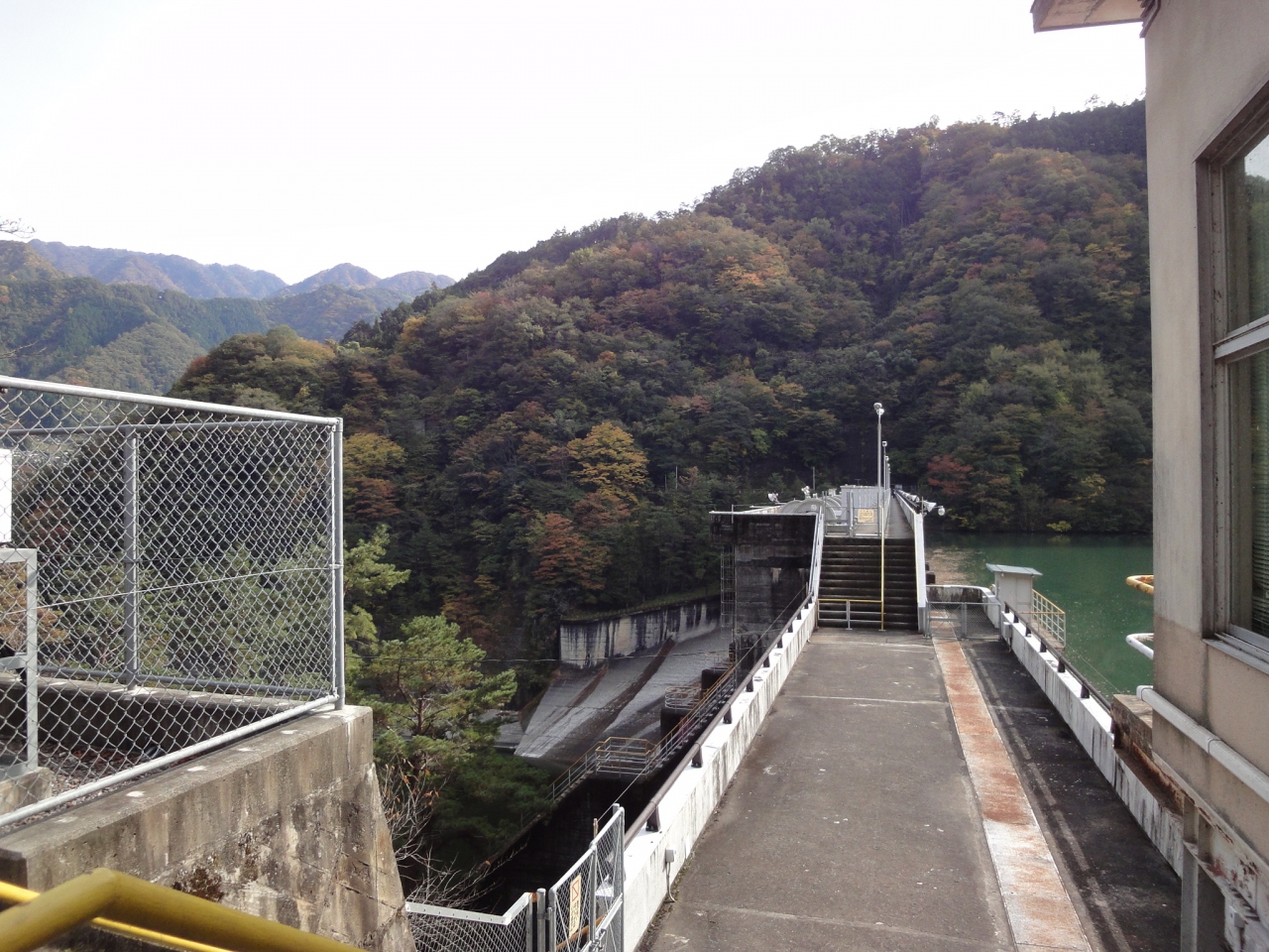 中部電力管轄の大きなダムで、実際そばで見てみると結構な迫力がありました。放水のある日ではなかったので、近くで釣りを楽しんでいる人などが多くいました。ダムの上は歩道が整備されていて、真上から眺められるようになっています。ここから放水が行われるのかと想像するだけで足がすくむような規模の大きさでした。