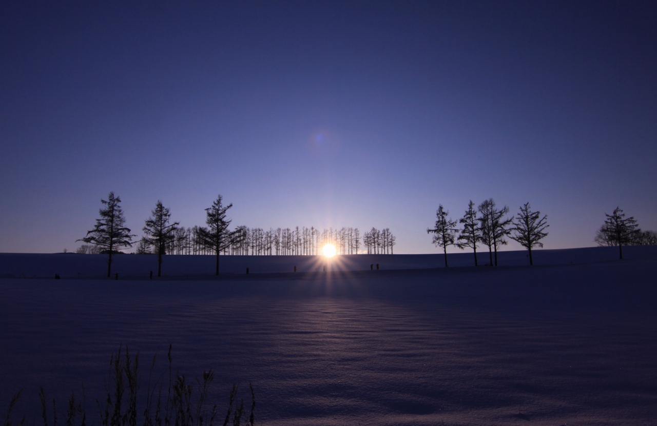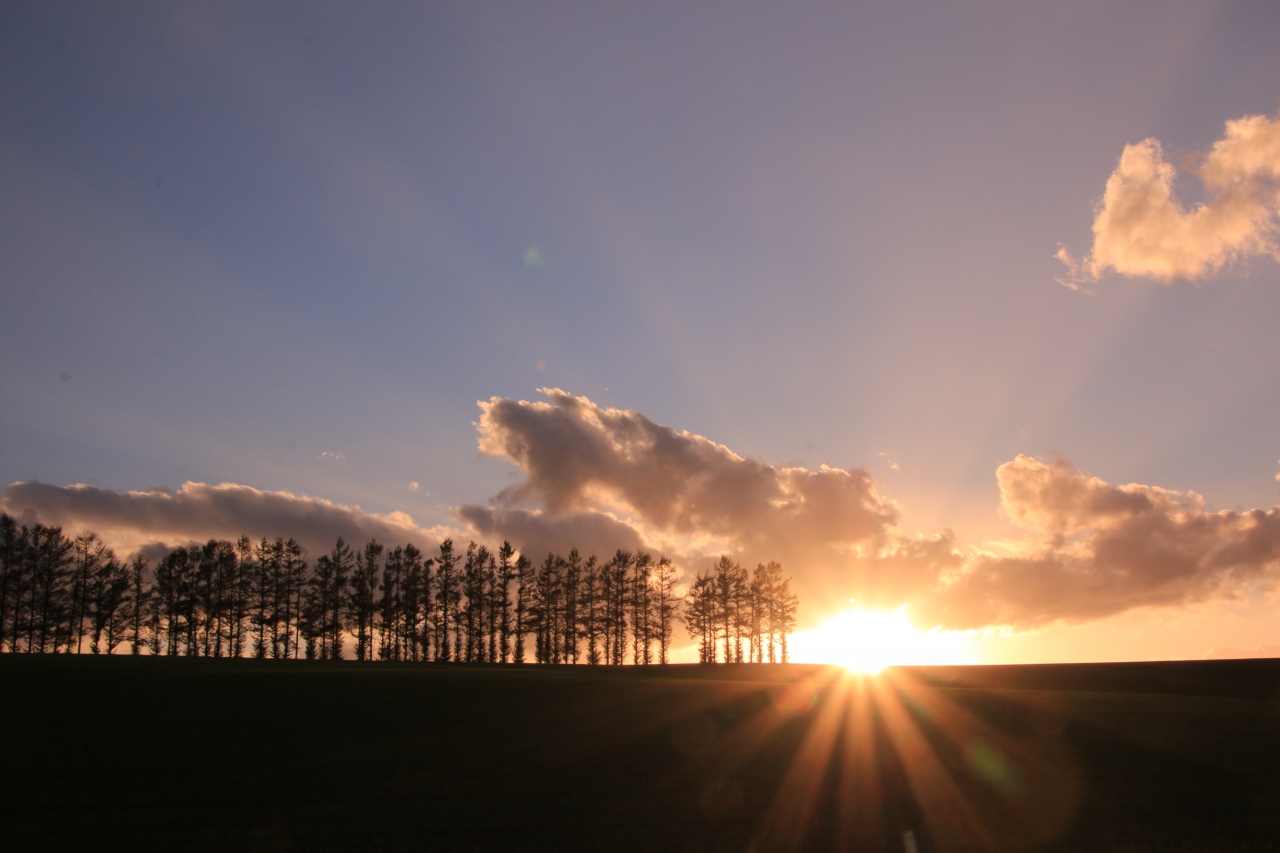 1月にマイルドセブンの丘に沈む夕日を見てその美しさに感動し、今回再び夕日の写真を撮りに行きました。冬は防風林の真ん中に日が沈んだのですが、10月は木々の右側に沈んでいきました。季節によって太陽の位置が違うのは当たり前ですが、イメージしていた位置とだいぶ違ったのでちょっとショックでした。写真を撮る場合は事前にチェックが必要ですね。勉強になりました。