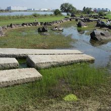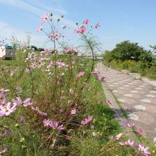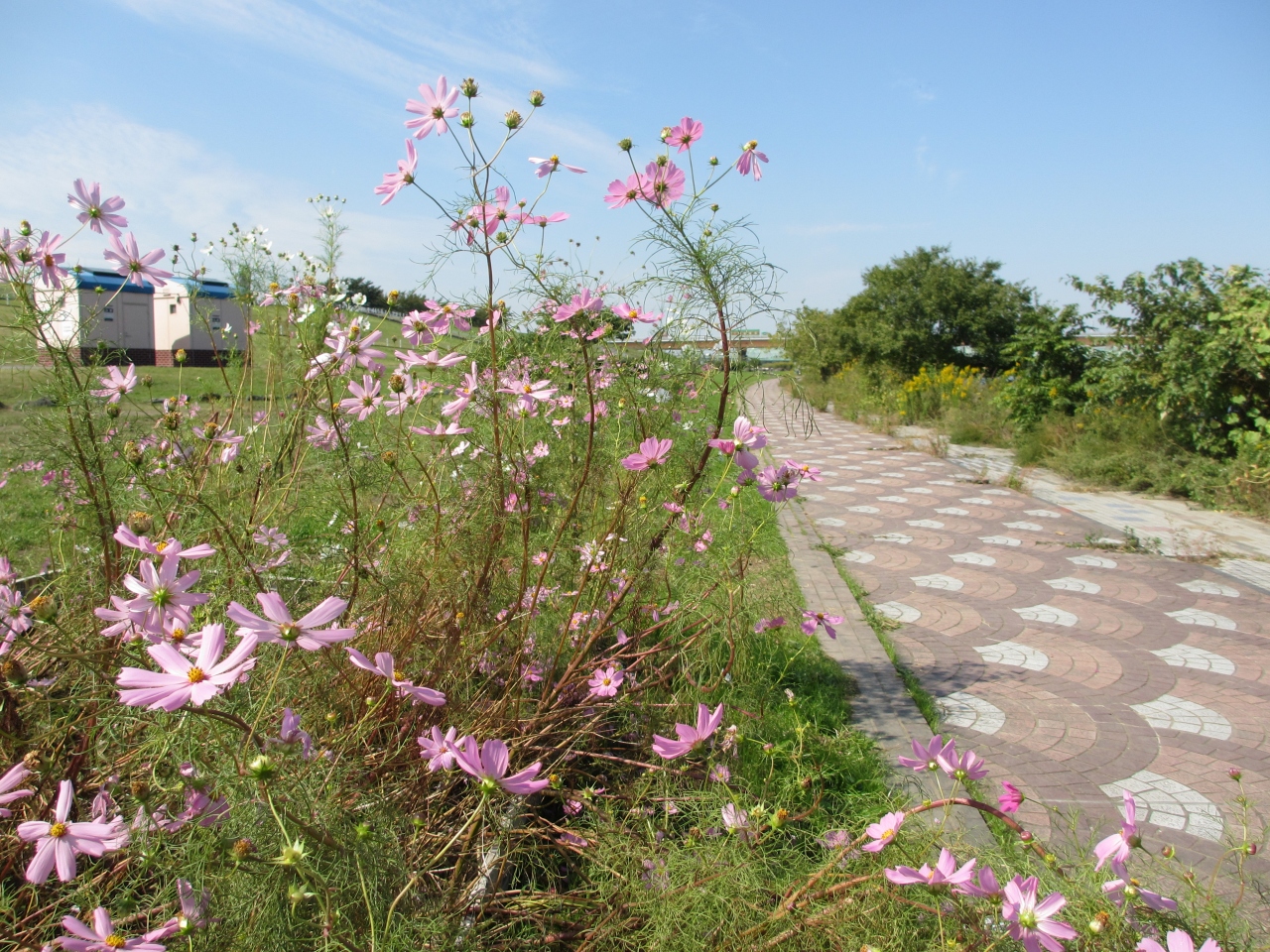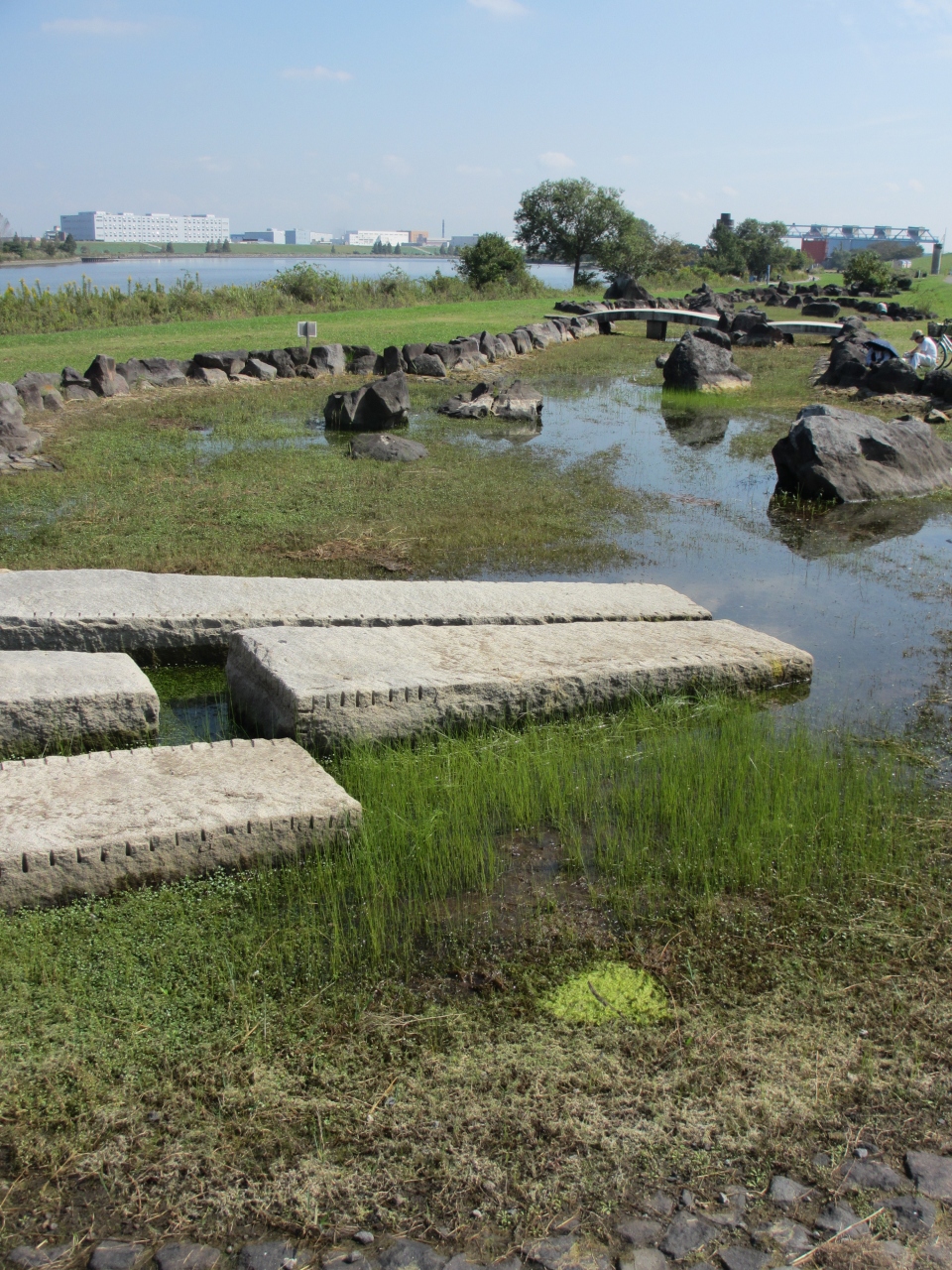 新河岸川と荒川の間にある緑地です。緑地の真ん中には石の公園も整備されています。緑地の川側は遊歩道になっていて季節によっては花もきれいに咲いています。土手側はサイクリングコースやランニングができるように整備されています。訪れた10月中旬のぽかぽか陽気の日には、日向ぼっこをする人、釣りを楽しむ人、のんびりサイクリングを楽しむ人など、それぞれ思い思いの生活を楽しんでいました。