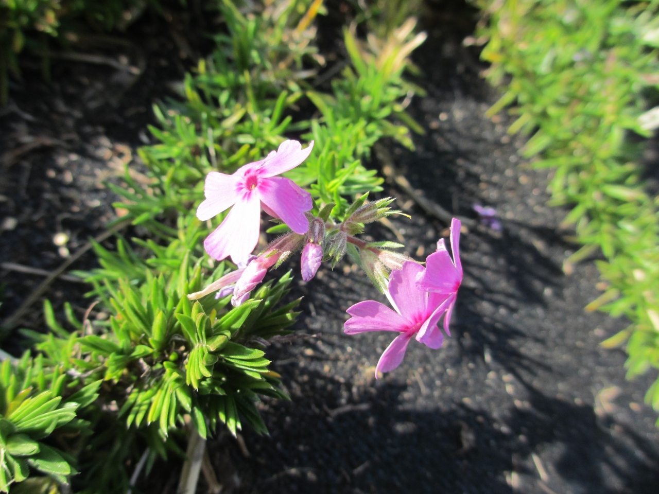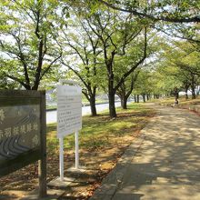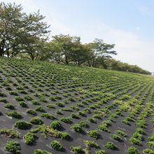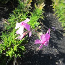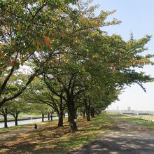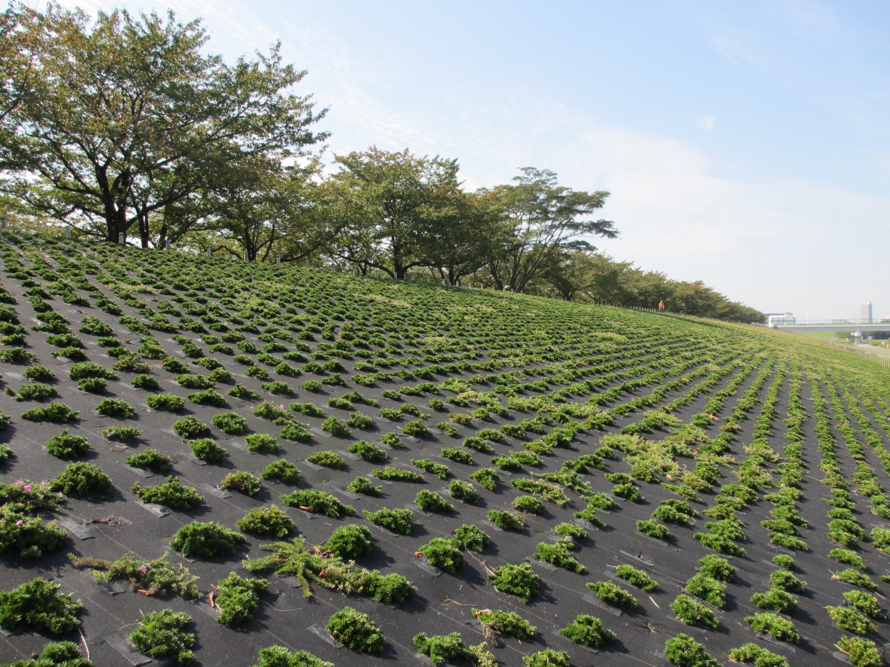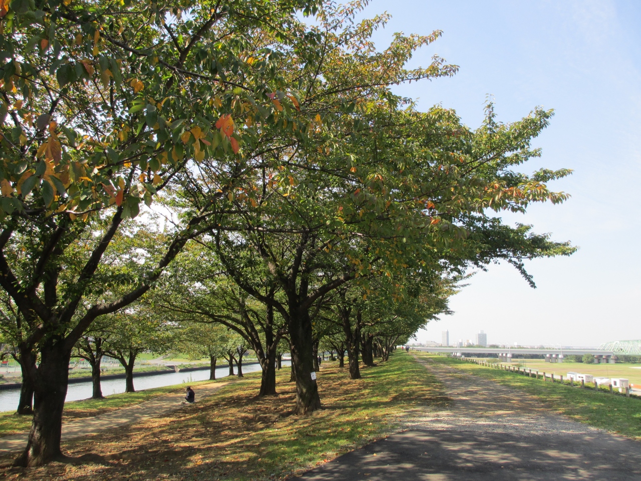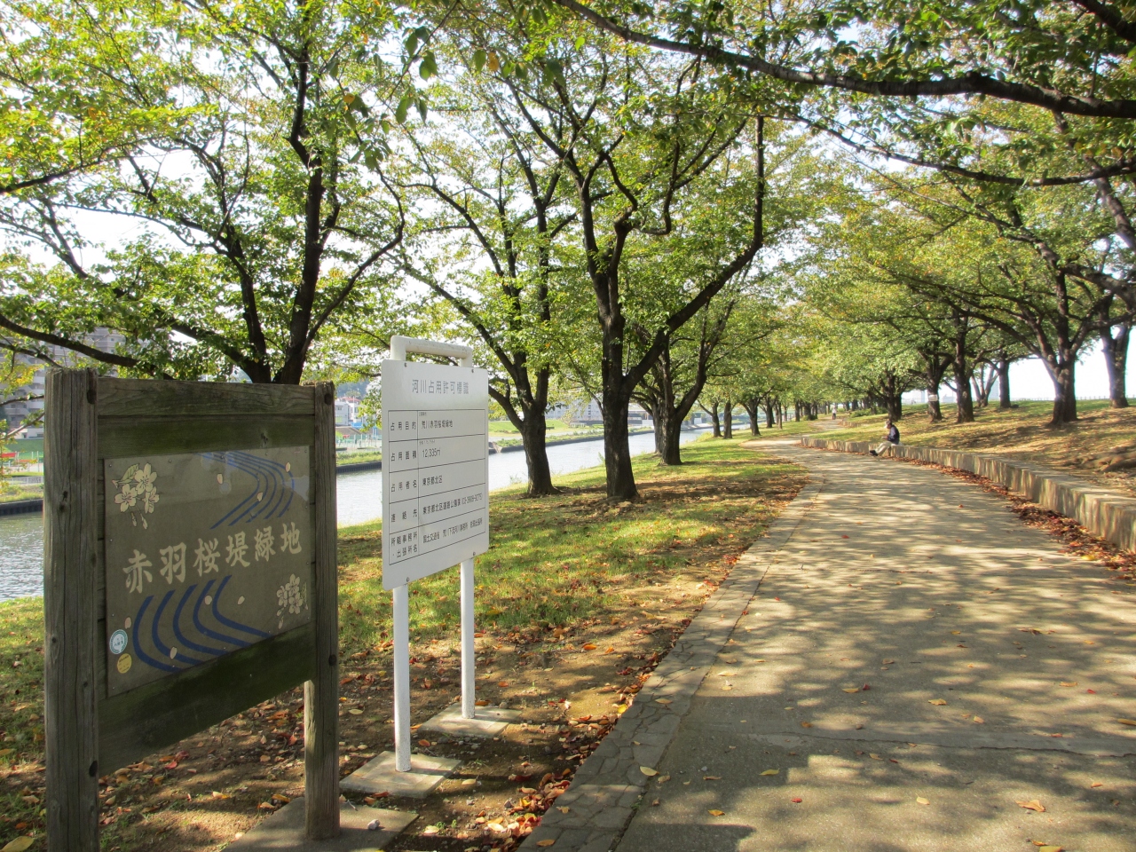 新荒川大橋近くの新河岸川沿いの緑地です。桜の時期は見事な並木道になります。新荒川大橋を渡り川口側から緑地を見ると、ピンクに染まった桜並木と、斜面に咲いた赤と白の芝桜が北区の文字をくっきり浮かび上がらせてくれます。10月に訪れたときは数輪の芝桜が花をつけていました。