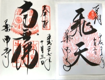 また、御朱印も前回と異なり、書置きのみ。和綴じタイプの金襴緞子地の大きな御朱印帳のみの販売で1頁目に貼ってくださいとのことでした。というわけで、仕方がないので大講堂で御朱印帳を購入し、仏足石・南無佛の御朱印をいただきました。見本が2種類しかなくて、もういただいていたので(というか佛足石やめちゃったのかな…と思って)他に無いかお訪ねしたら、「ありますよ~」と見本の裏面を見せてくださいました。裏にも見本があったんですね。気づきませんでした…