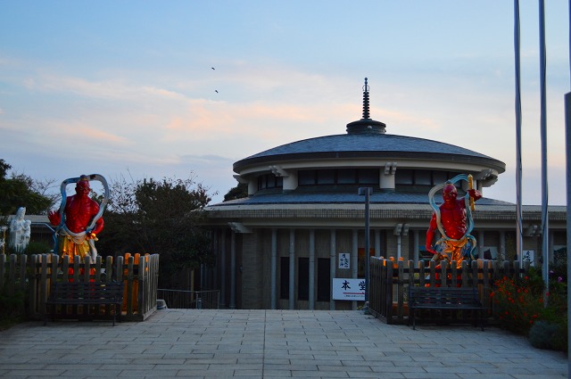 江ノ島に上り、サムエルコッキング苑(江ノ島灯台がある場所)のちょっと先にあります。赤い大きな仁王像が目印です。江ノ島はそれほど大きくはないのですが、たくさんの名所があるためか、この建物の近くにはほとんど立ち寄る人の姿がみられません。