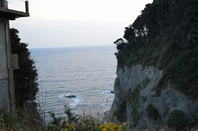 江ノ島サムエルコッキング苑(一番の高台)をすぎ、下り途中にある展望場所です。江ノ島は意外と坂道が多く疲れますので、この高台で、海を眺めながら休憩するにはいいかもしれません。隣にある、壁がボロボロの建物も気になります。ここからは下りが多いので反対側の海まで行きは楽になります