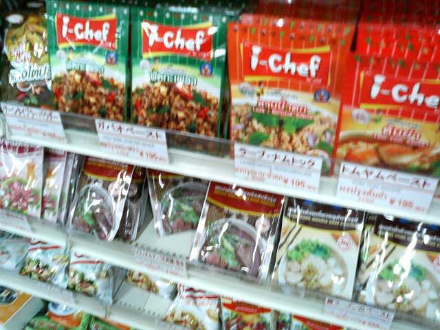 店内はスーパーのような感じで、タイ焼きそばやガバオ、トムヤムクン用の調味料やタイのお菓子、冷凍食材など珍しい品が並び、ちょっとしたタイ旅行気分で買い物を楽しめます。