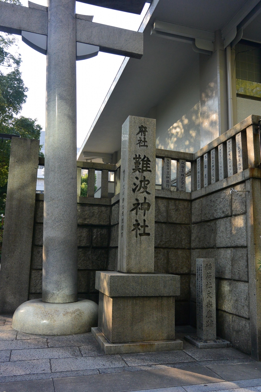 植村文楽軒が難波神社の境内で人形浄瑠璃の芝居を打ったことから、文楽座跡の石碑が立っています。東側・御堂筋に面した入口の右横、難波神社と書かれた石碑の横に並んであります。小さいので見逃さないように・・・。