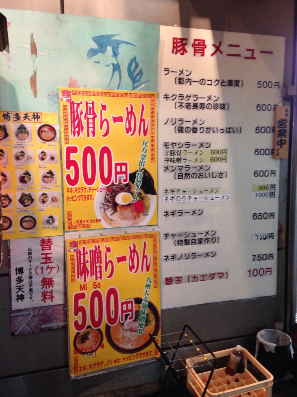 昼も夜も500円で豚骨ラーメンが味わえて。