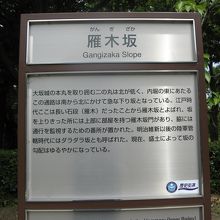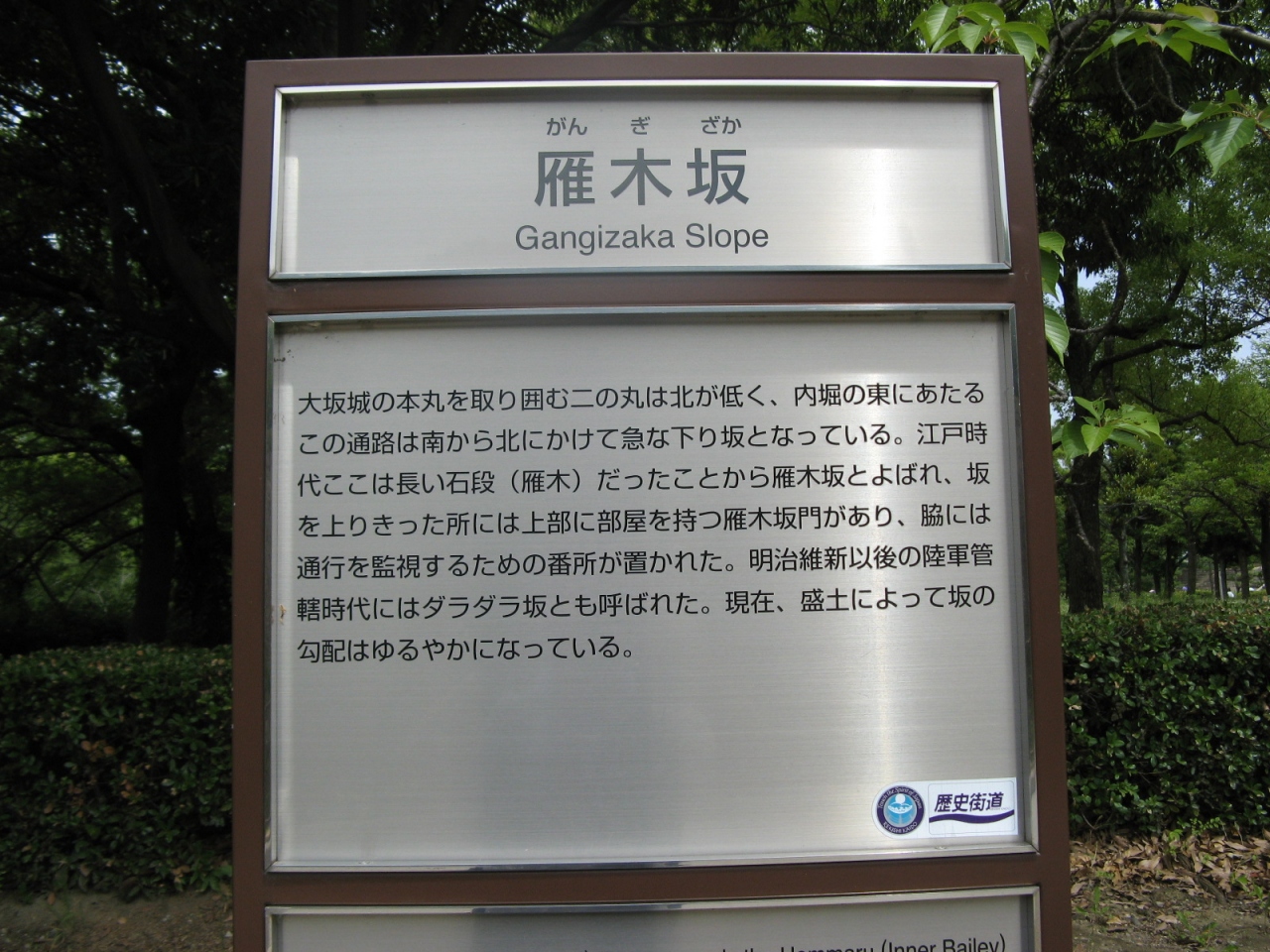 大坂城内、内濠と東外濠の間にある長さ300m足らずの長い坂です。現地にあった説明板には『大阪城の本丸を取り囲む二の丸は北が低く、内堀の東にあたるこの通路は南から北にかけて急な下り坂となっている。江戸時代ここは長い石段(雁木)だったことから雁木坂とよばれ、坂を上りきった所には上部に部屋を持つ雁木坂門があり、脇には通行を監視するための番所が置かれた。明治維新以後の陸軍管轄時代にはダラダラ坂とも呼ばれた。現在、盛土によって坂の勾配はゆるやかになっている。』と記されていました。