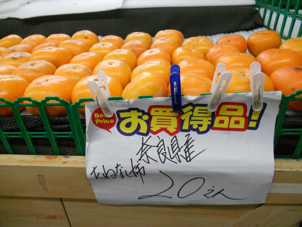 野菜や果物も安くて、ネギが4本で98円とか、奈良産の種なし柿が1個20円、大根(少し小さめ)が1本48円など、お買い得品が結構ありました。