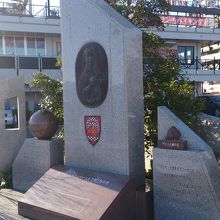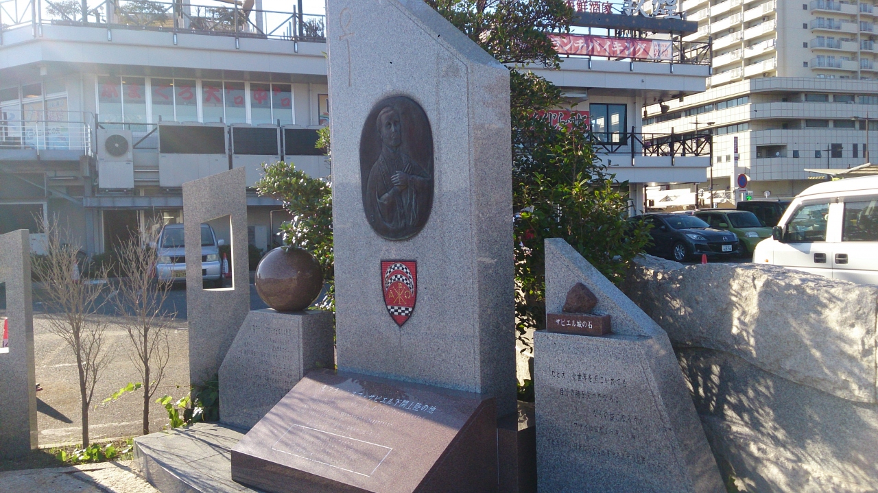 唐戸市場のすぐ脇の関門海峡を見渡せる場所にあって、ザビエルのレリーフが埋め込まれた御影石で造られた、かなりの大きさの石碑で台座も平たく薄いですが大きくて、レリーフの埋め込まれている石碑の右サイドにもザビエルの故郷のザビエル城の石が組み込まれた石標があって、左手にもかなりの大きさ真ん丸い石が設置された石標があるので、非常に目立っていました。ザビエルを知らない人は少ないですが、なぜ下関にこの石碑があるのかは、石碑に刻まれた説明でわかるようになっているのがありがたいです。