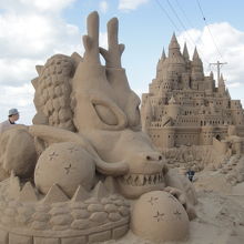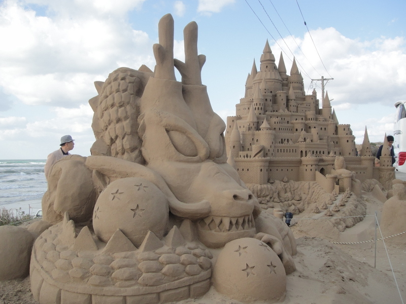 千里浜と言えば、車が走れる砂浜で有名ですが、海岸には砂で造った彫刻、砂像がいくつも展示されていました。そういえば、昔TVで見たことがあったのですが、砂だけでこういうアートが造れるなんて、車も走れる砂浜の、そういう砂の質も影響しているのでしょうか。