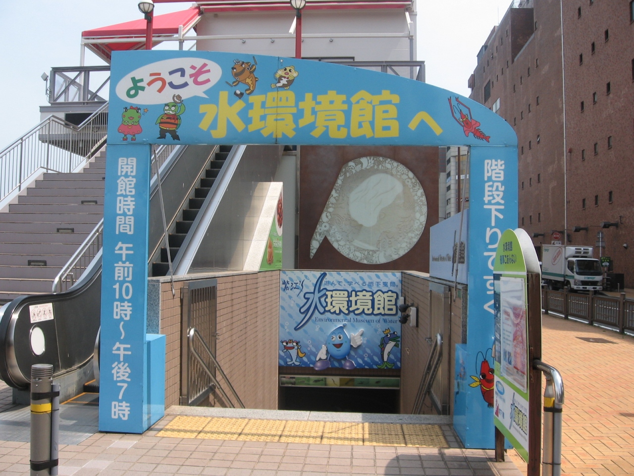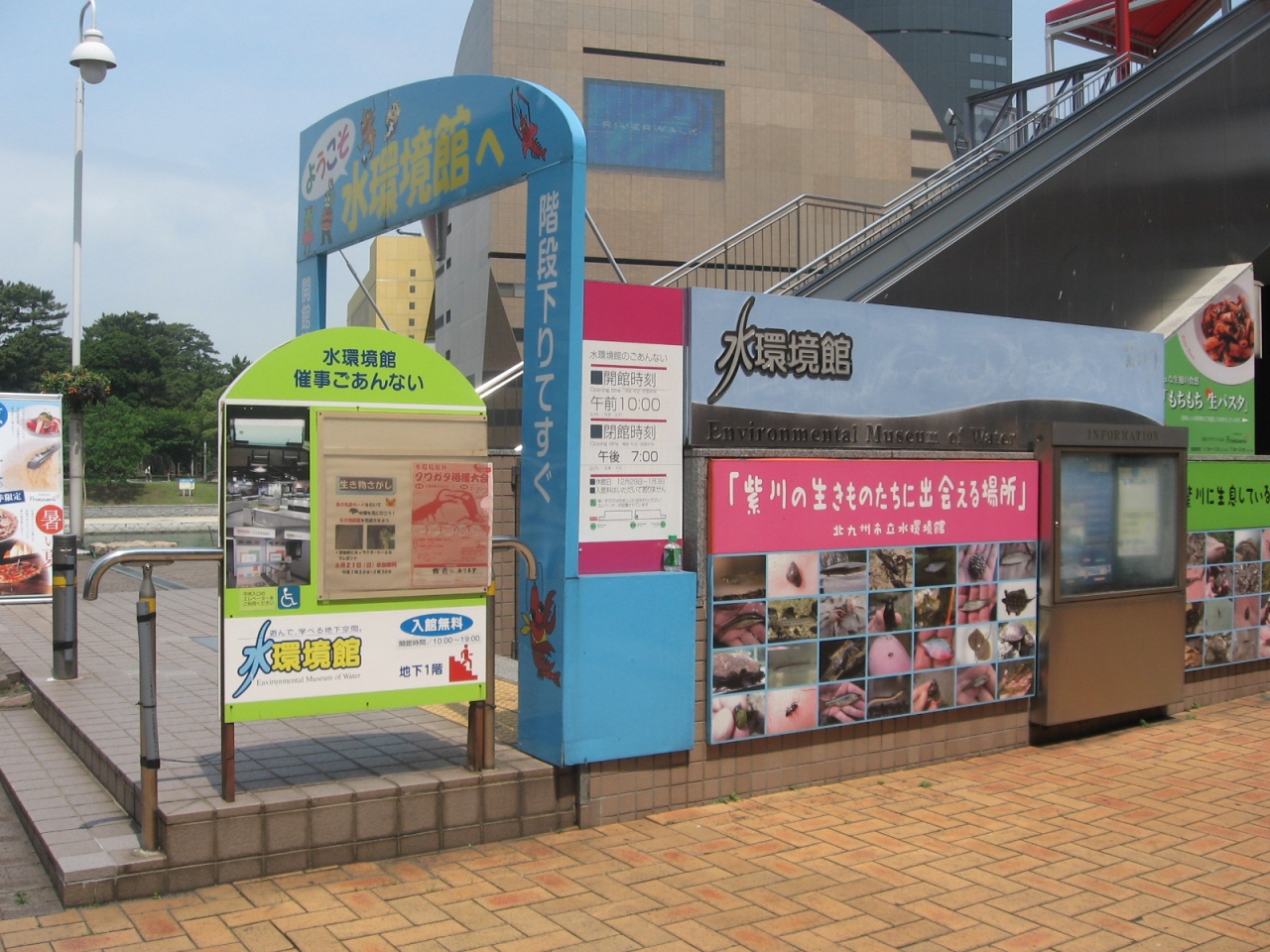 隣の紫川の水生生物を中心に展示してあります。いちばん驚いたのは、厚いアクリル板を通して紫川をのぞけることです。今、川の中を泳いでいる魚をそこに見ることができるというのは、不思議な感じです。もし、川にもぐることができたら、川のほうから環境館のお客さんを見ることができるということかな、と想像しました。
