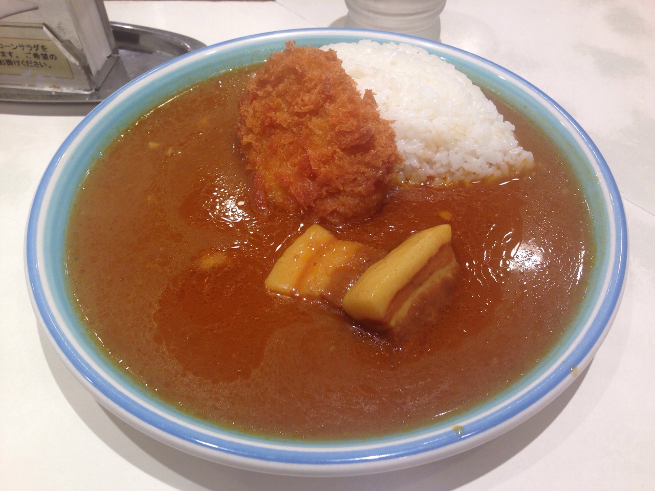 ルーはしっかりと味がついてますが、サラサラのスープです。これに、ご飯やコロッケが良い感じでなじんでます。