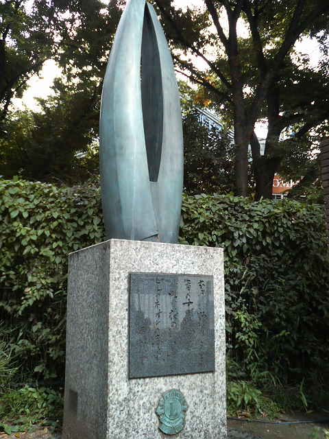 青銅の尖った形で、台座の部分のプレートに刻まれている「伸びゆく新宿」という詩のタイトルにちなみ花の芽を表現しているとのこと。