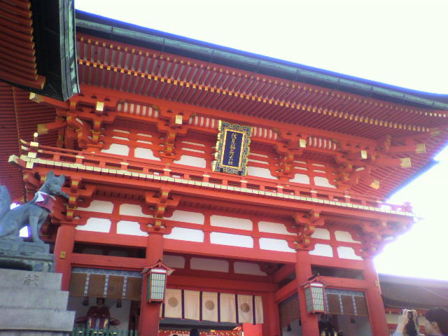 伏見稲荷大社にお参りです。駅のほうから鳥居を2つくぐった後に出会うのが朱色の鮮やかな大きな楼門です。