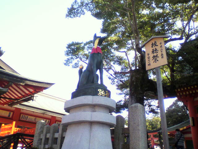 伏見稲荷大社にお参りしました。境内にはあちこちにキツネがいます。まず目に入るのは楼門の両脇のキツネ。狛犬ならぬ、狛キツネです。