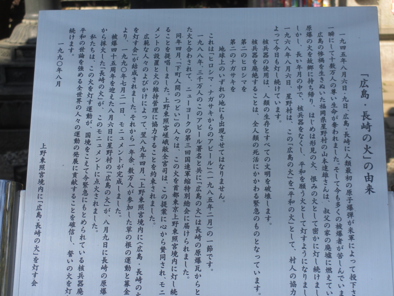 上野恩賜公園内にある上野東照宮の大石鳥居と水舎門をくぐり石燈籠が並ぶ参道を進むと右手にこちらのモニュメントがあります。1990年に造られたそうです。広島と長崎の火が燃えています。平和を考える貴重な機会を思いがけないところで得ることができました。