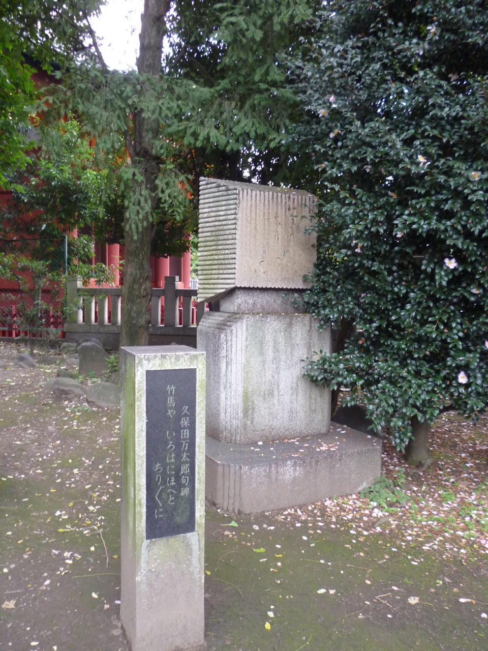 浅草神社にあります。久保田万太郎は、浅草生まれで、明治時代に活躍した俳人であり作家でした。「竹馬や いろはにほへと ちりぢりに」この句は、浅草小学校時代を思い出して詠んだ句だそうです。四角いおしゃれなデザインの句碑でした。