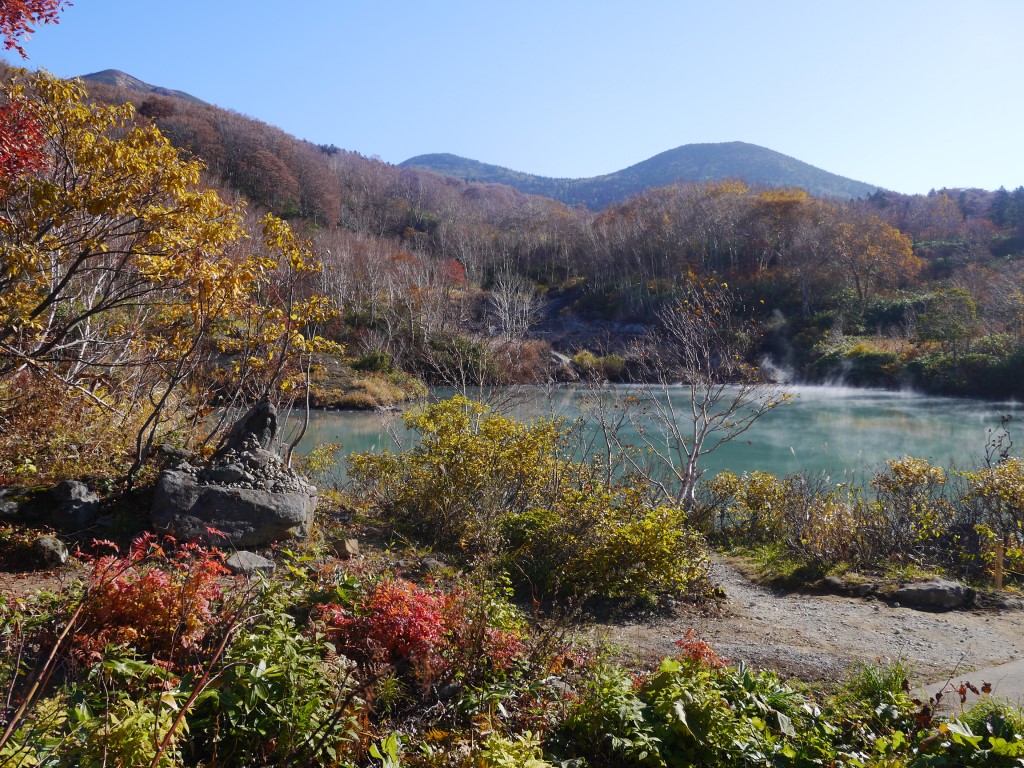 10月中旬で紅葉は終わりかけでしたが、湯気を放ったグリーンがかった湖面とまわりの木々の紅葉の彩りがとても綺麗でした。