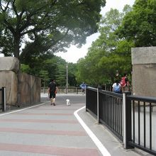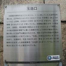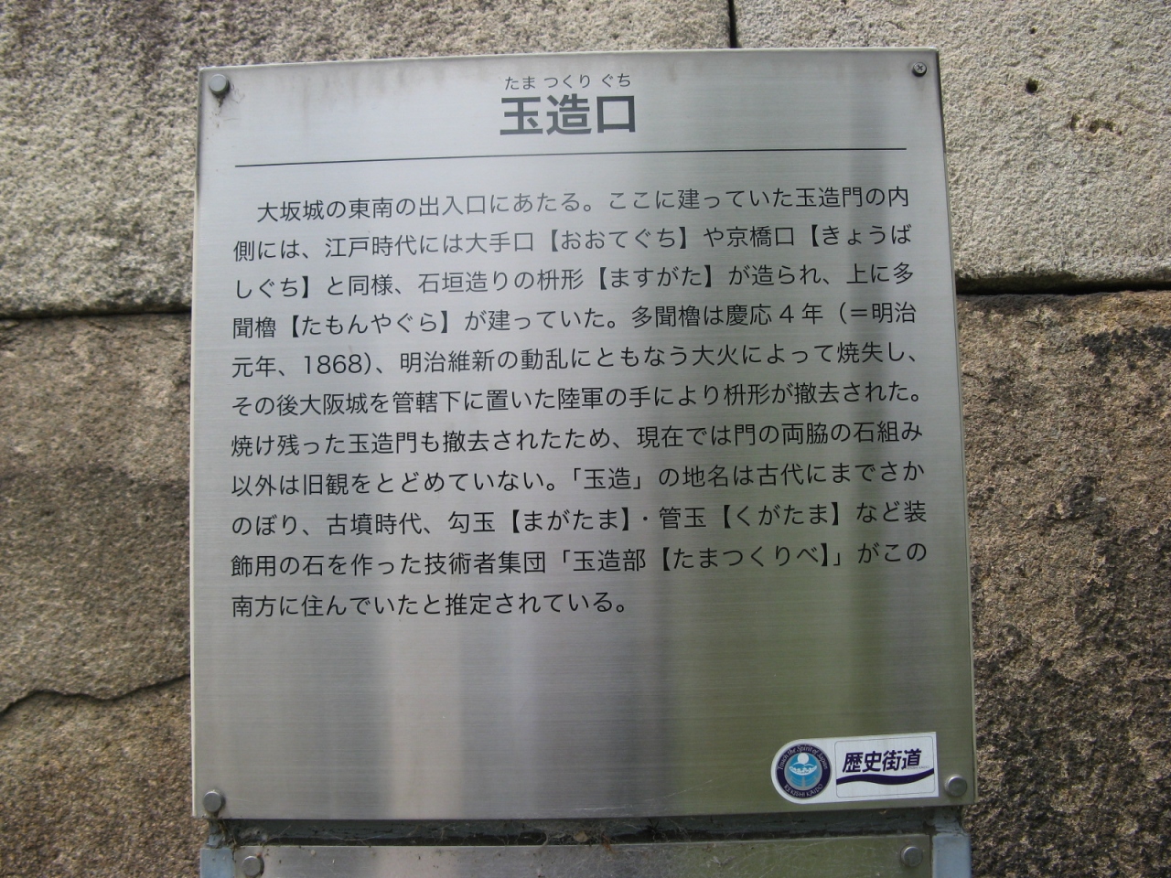 JR森ノ宮駅から大阪城公園内を北西に7分ほど歩いたところにあります。玉造方面に向かって口を開いていることからこの名があるそうで、もともとは大手口、京橋口と同じく多聞櫓を備えた石塁による枡形構造であったが、戊辰戦争や太平洋戦争の空襲によって焼失したそうで現在は石塁の一部が残るのみです。枡形の石塁も大正年間に軍部によって大部分が撤去されていて、創建当時の様子は伺えませんが、大きな石や銃眼のあとなどが見て取れます。