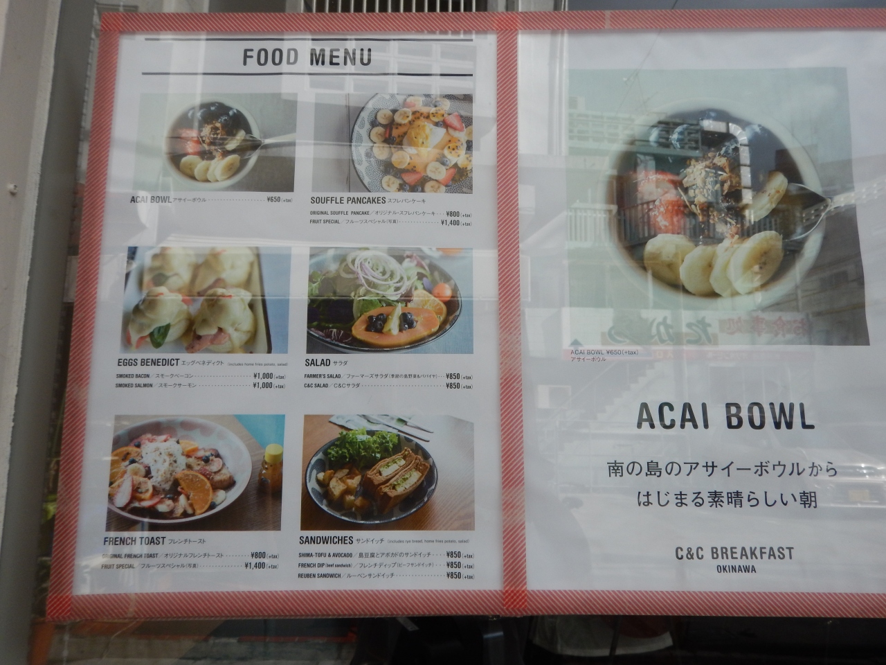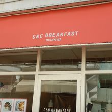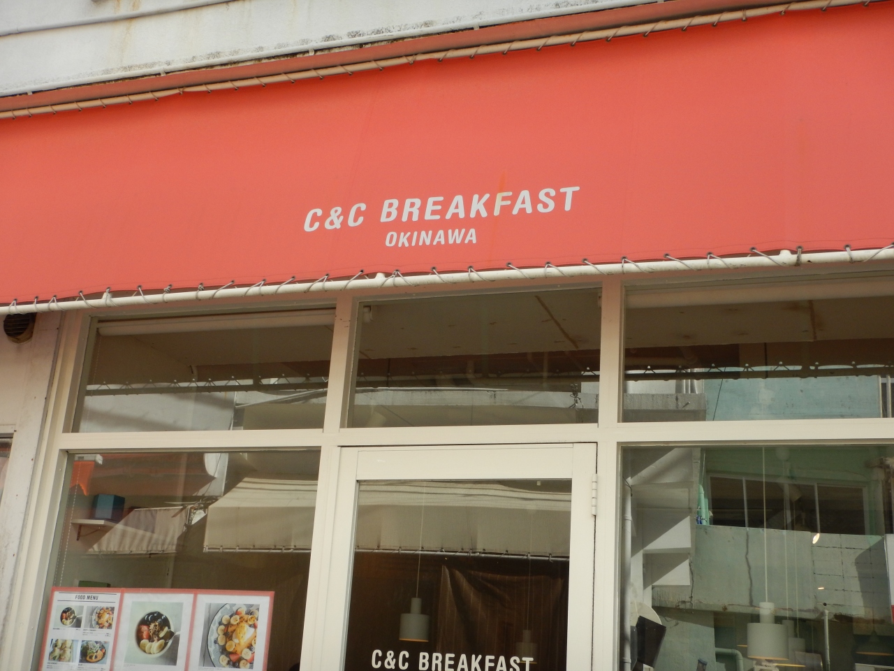 国際通りから、市場本通りに入り少し歩くと、松原屋製菓が見えてきます。そこを右側に曲がり少し行くと、左側にC&C BREAKFASTがあります。道の反対側はポークたまごおにぎり本店です。とても人気のようで、開店30分後ぐらいに着いたのですが、何組か並んでいたので諦め、次回は開店前に行ってみようと思いました。メニューを見ると、値段は結構高めだと感じましたが、一度は行ってみたいお店です。