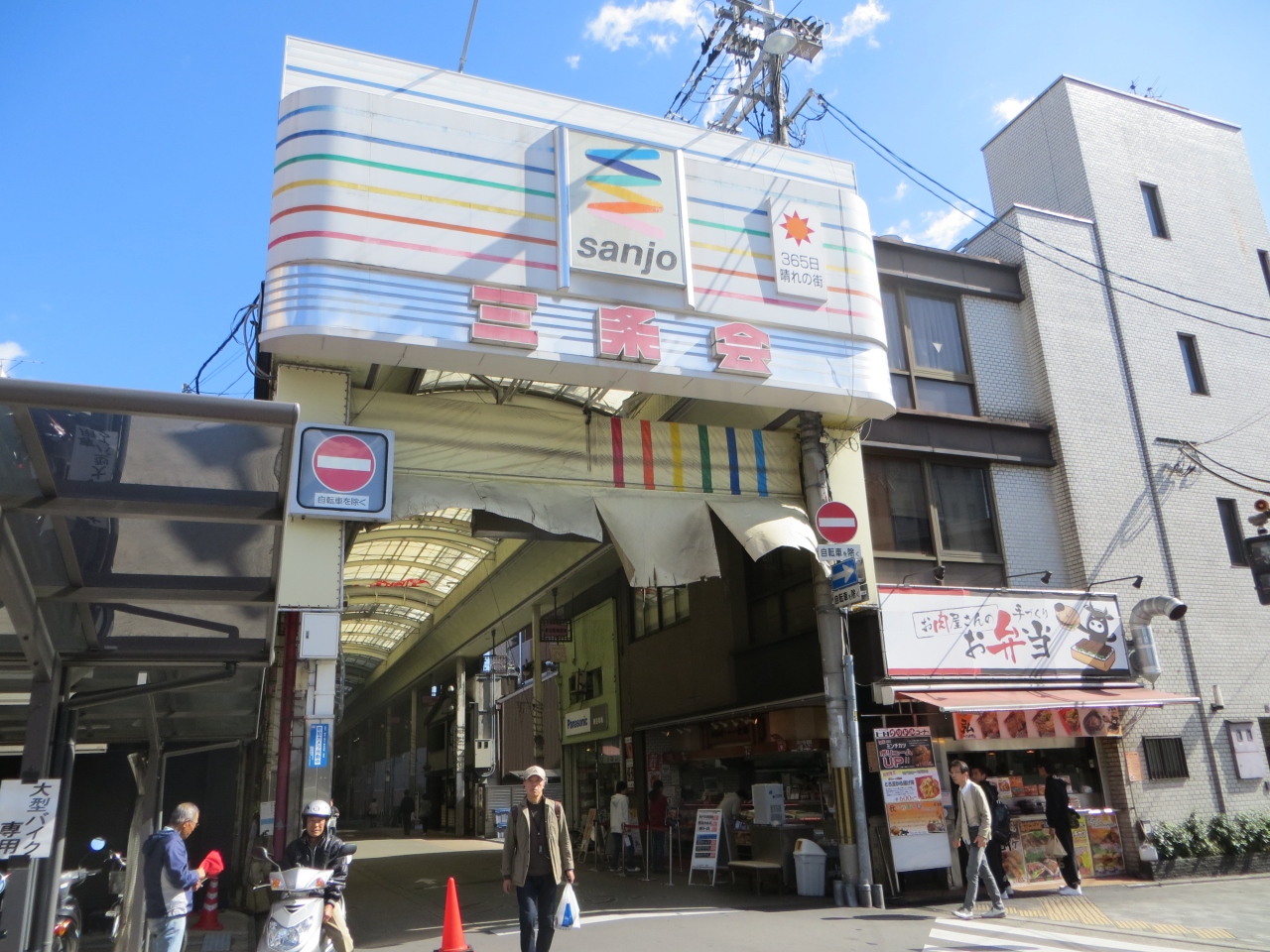 三条通にある商店街は千本通から堀川通まで、すごく長い商店街です。道がまっすぐなのもさらい長さを感じさせるのかもしれません。シャッターが閉まったお店も多くあるのですが、この長さですから、何かしらある。SEIYUやフレスコなどのスーパーもあって便利。