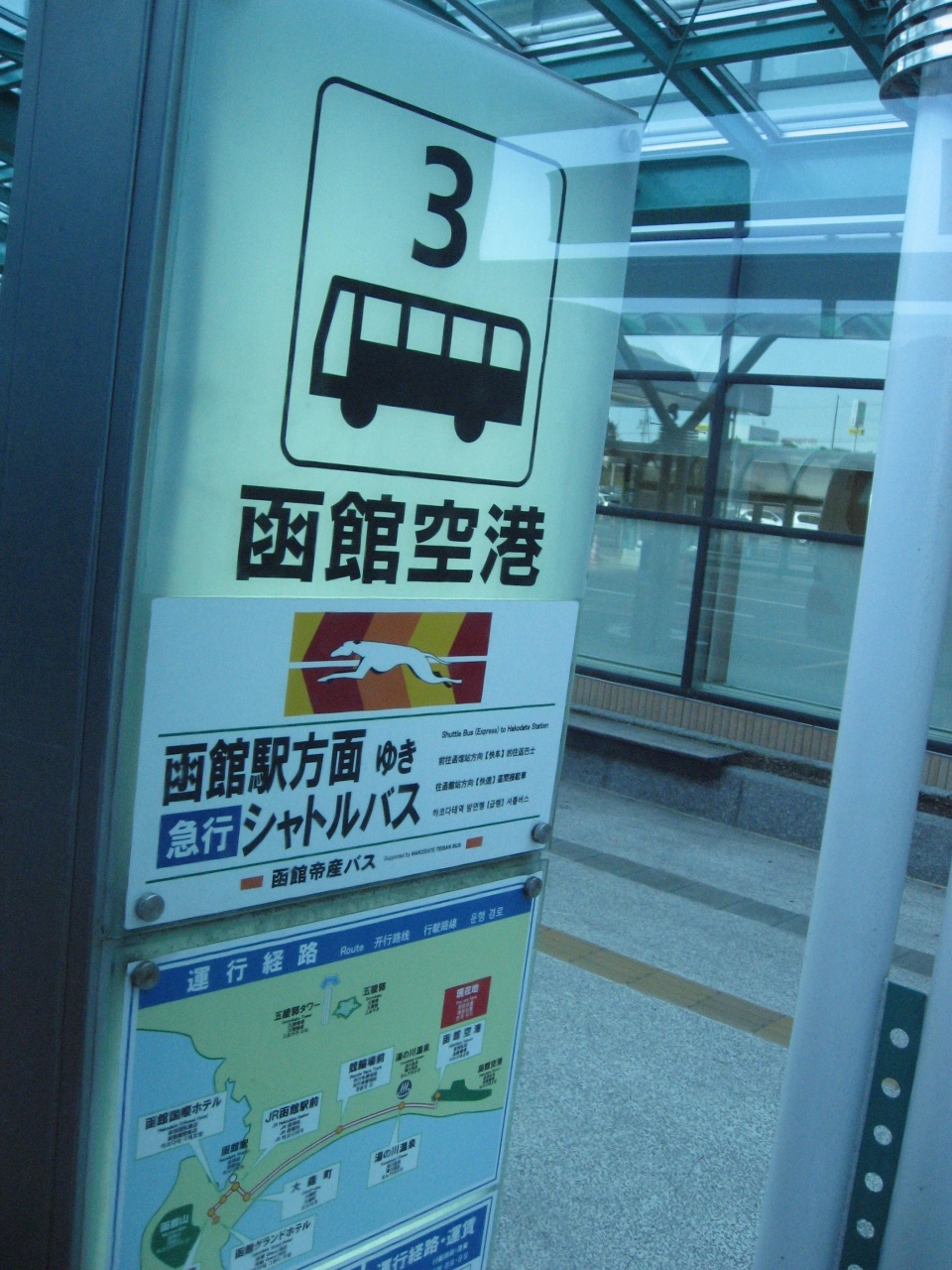 空港を出るとすぐにあります、函館駅前まで約20分410円、空港から乗るときは後払い・市内から乗る場合は先払いでした。おつりがないように先に両替しておいた方がいいです。途中海沿いを走るので景色がよかったです。市内に行くには一番便利ではないかと思います。