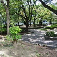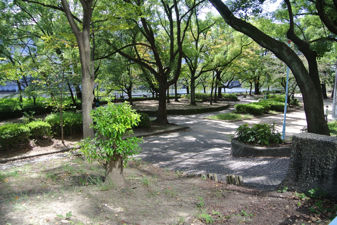 大川の北岸に、天満橋から天神橋まで続く長細い公園です。ブランコなどもありますが、子供たちが遊ぶ公園というよりは、緑豊かで、都心にあって貴重な緑地帯といったところです。遊歩道があって昼間散歩するにはいいところです。