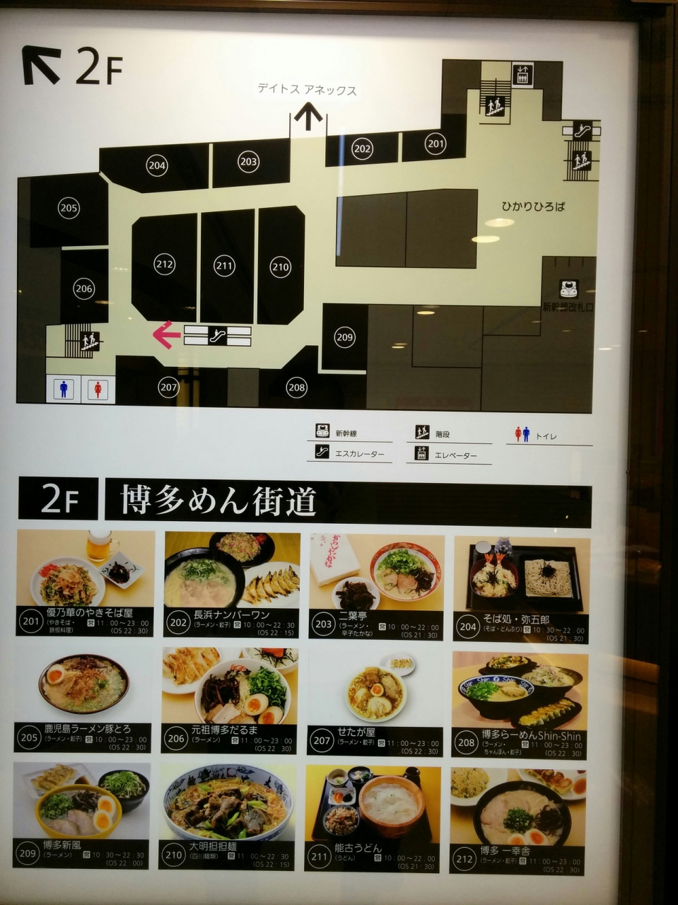 博多駅の「みやげもん市場」側の2階にある新幹線乗り場近くに「博多めん街道」と言うラーメン専門店があります。