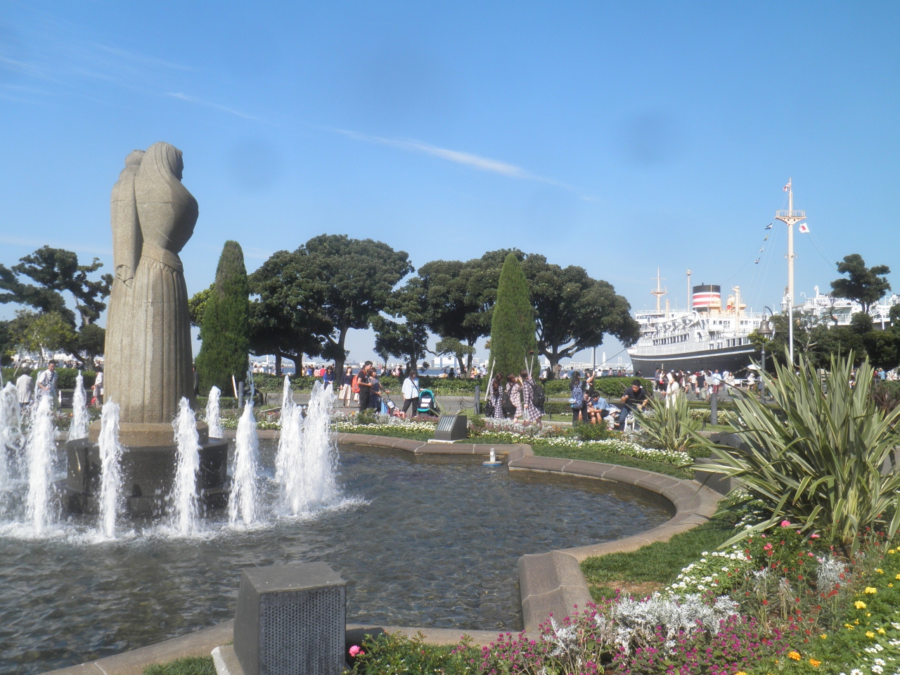山下公園には、有名な赤い靴の女の子の像や氷川丸などのほかに、かもめの水兵さんの歌詞の石碑などみどころが点在しています。 水の守護神像は噴水の中に立つ大きな像で、横浜の友好都市のサンディエゴから寄贈されたものなのだそうです。