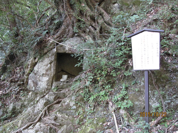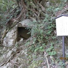 女坂の七不思議の六番目が「潮音洞」です。屈折しながら登っていく道の左側の崖あにります。大きな木の根に絡まった岩に四角い洞があいています。