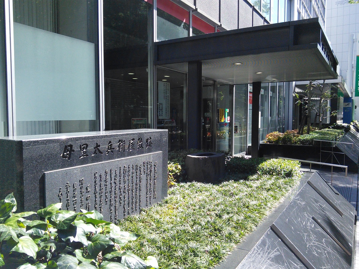 母里太兵衛屋敷跡の石碑は天神の大通りにある野村証券のビルの植え込みに設置されています。