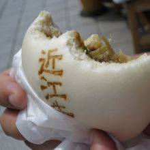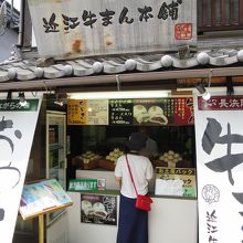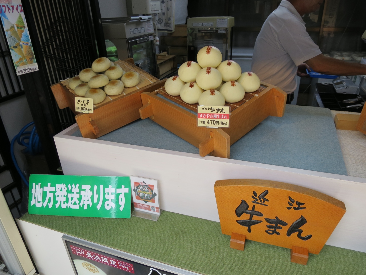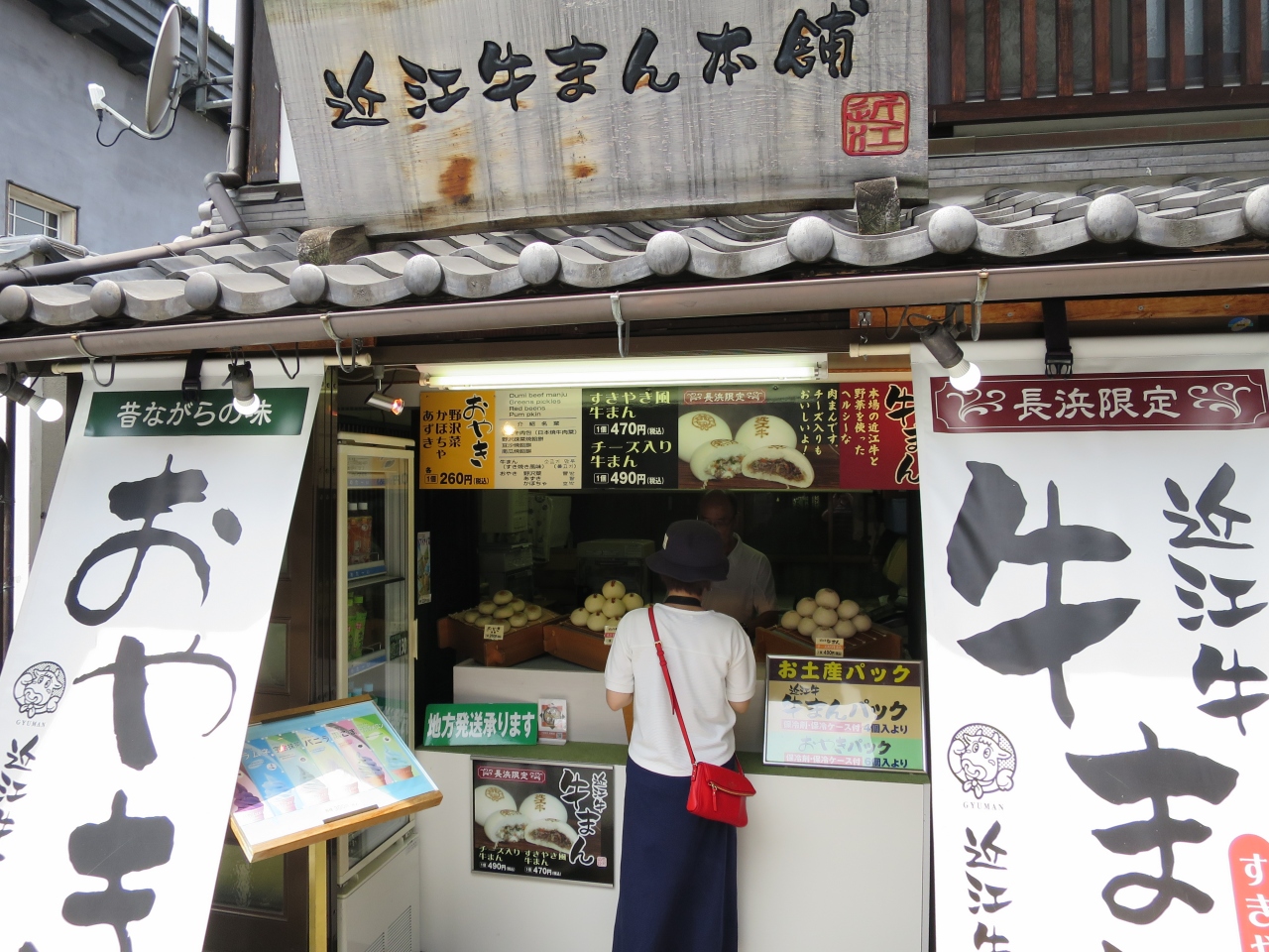 長浜 黒壁スクエアの黒壁ガラス館の右隣に近江牛まん本舗があります。店の前には座るところも用意されており、店頭で食べることが出来ます。近江にきて近江牛をまったく食べていなかったので、近江牛まんを食べたのですが、確かに牛肉は入っているものの、近江牛だから美味しいと言う訳でもなく、期待外れでした。