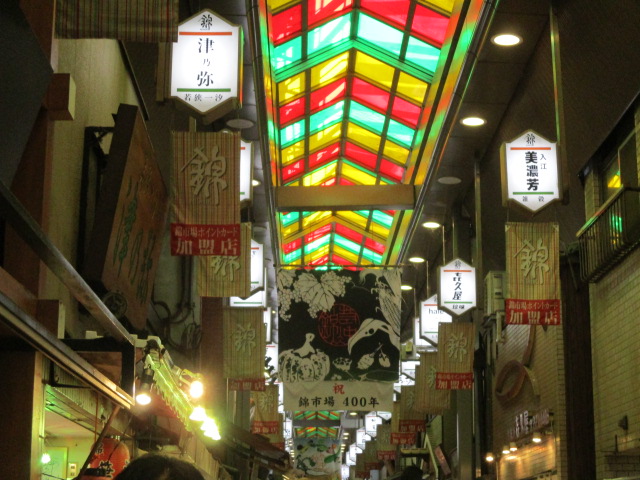 錦市場には古くからのお店と新しい観光客向けの店が混在しています。観光客が押し寄せるので狭い通りが混雑して歩きにくい・・買い物をするなら、時間を余分に見ておきましょう。くずし、練り製品を食べ歩きする人が目につきました。たこ焼きのカリカリ博士が大人気でした。