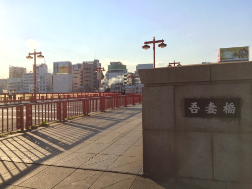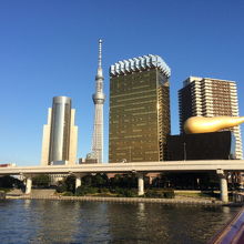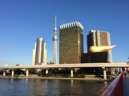 スカイツリーから浅草に向かって歩いて来たらアサヒビールの金のオブジェが見えます。その先に赤い橋が見えます。