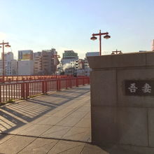 橋の途中で振り返るとアサヒビールのビルとスカイツリーがちょうどきれいに並んで見えます。