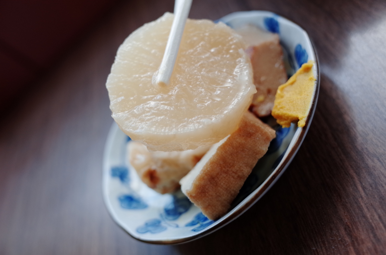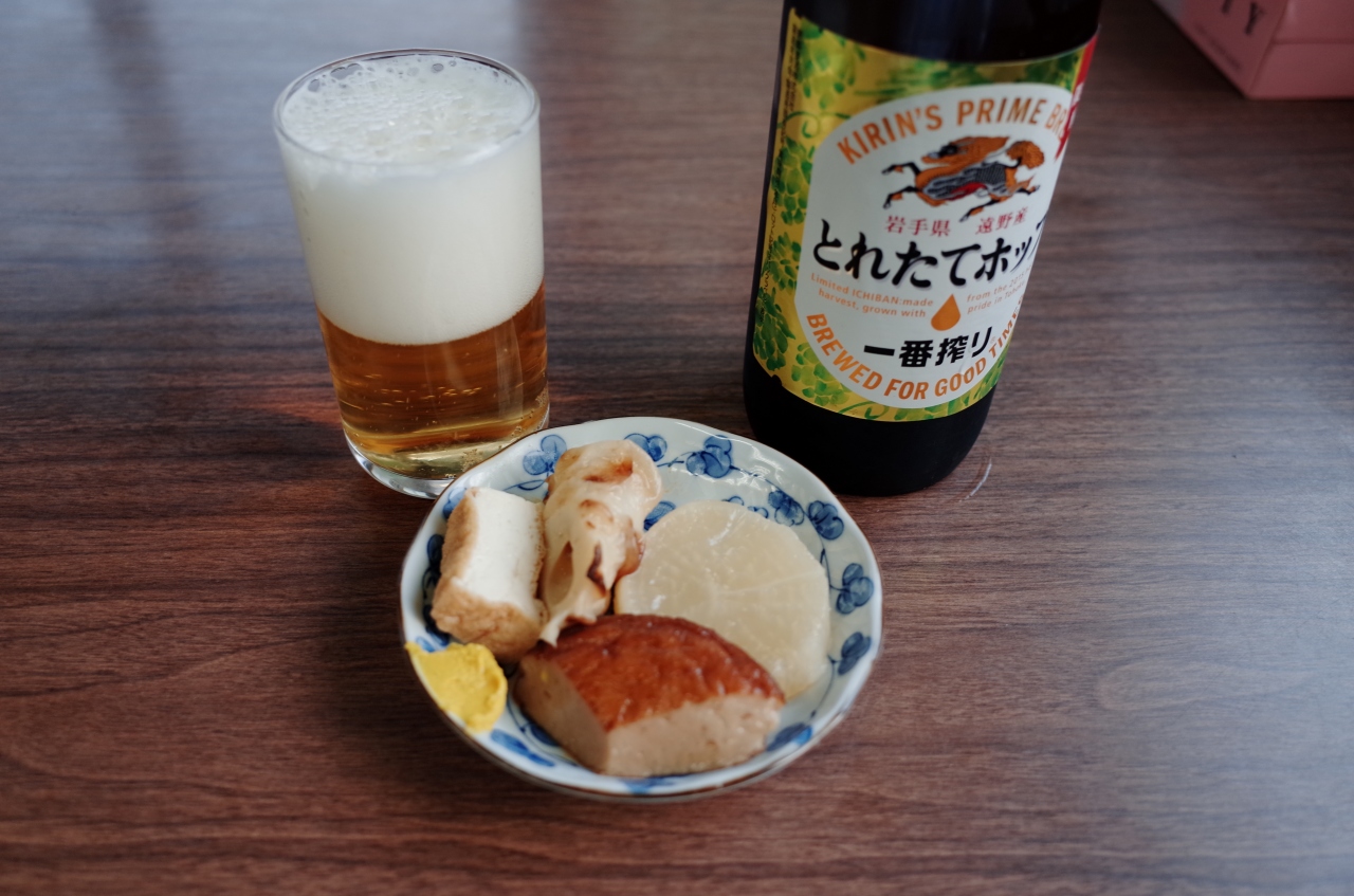 こんな店来たらやっぱり昼から飲んじゃうよ。「ビールください」大瓶600円を注文。「勝手にとってー」と奥からの声。「いーーんですか?」と聞くと、「勝手にやってー。一人だからごめんね」。ビールと一緒に、無料のかわいいおでんのおつまみが出てきた。こういうの嬉しいなあ。僕は玉子丼650円を注文した。
