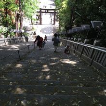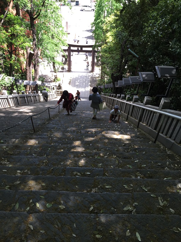 愛宕神社の参道の険しい石段のことですけども上るときよりも降りる時に見降ろすのが怖いですね。うちの子供は高所恐怖症なんですけどもヒエエと怖がってましたよ。なんとかおりられましたけどね。どうしても怖い人は裏口から車道を通って抜けられますよ。