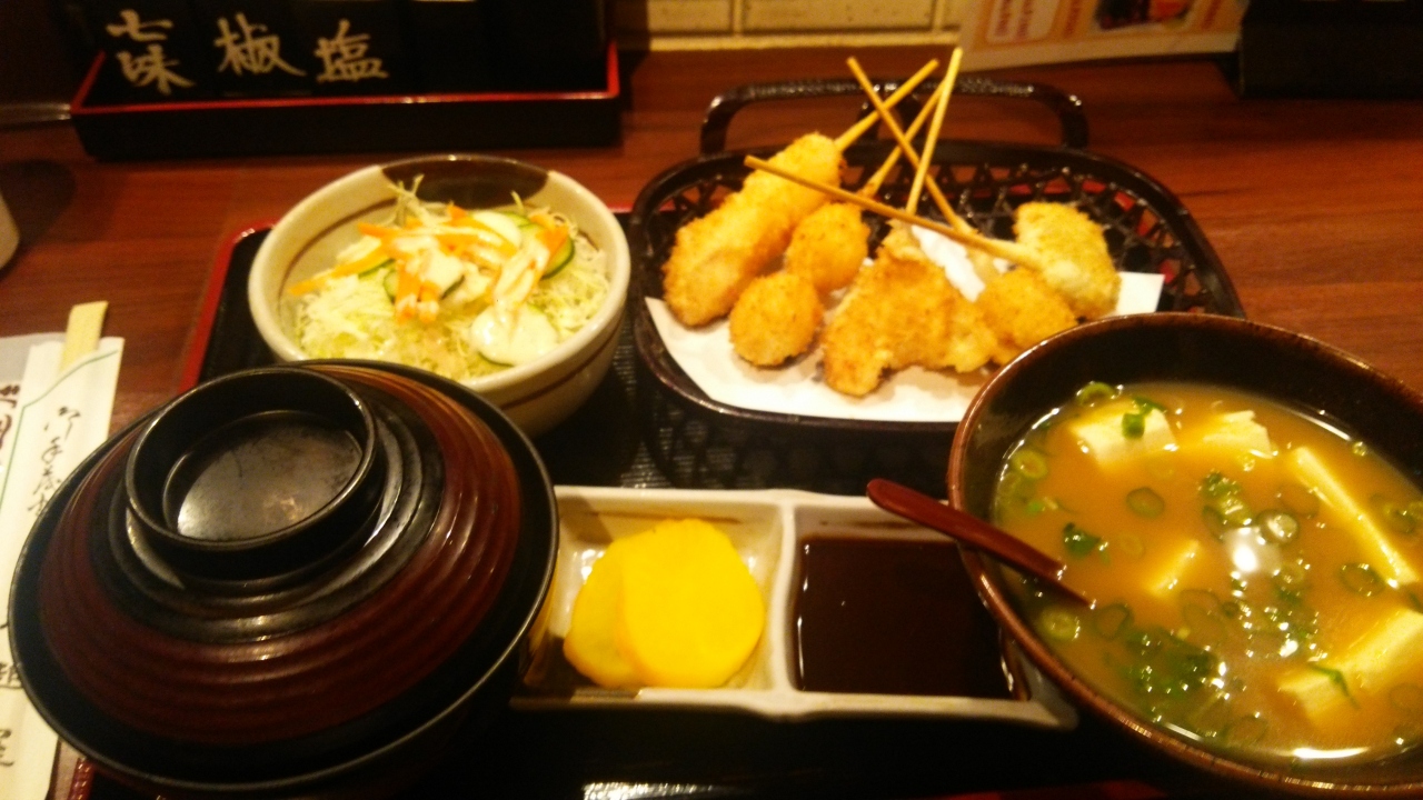 阪急梅田駅からすぐのホワイティ梅田にある正起屋。夜は焼き鳥の美味しい店ですがお昼はランチをやっています。ランチのおすすめは湯豆腐定食780円。串かつに加えて湯豆腐をいただけます。こちらはお湯で煮るのではなく少し味のついたスープで煮るので豆腐が美味しです。