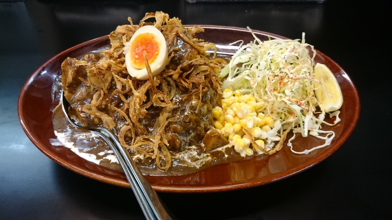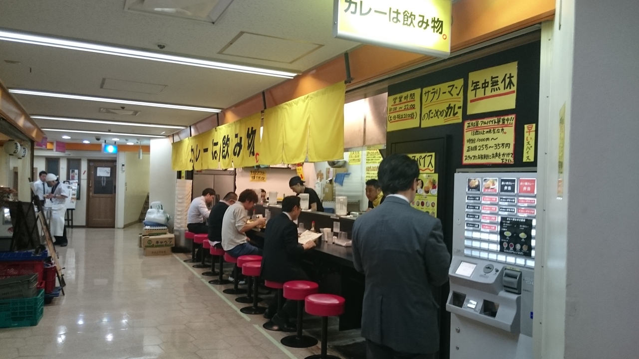 黒カレーと赤カレー、10種類のトッピングから3つ選択。トッピングは店員さんが聞いてくるまで言ってはいけないなど、池袋と全く同じです。以前はご飯の盛りが、3種類でしたが4種類になりました。でも価格は同じ。黒も赤も890円になりました(昔は赤が100円安かった)。これも池袋と同じ。池袋と違うのは、サラリーマンの聖地、新橋にあるためか、結構遅くに行っても、カレーも残っているし、待ち時間も短い気がします。ニュー新橋ビルの奥の方にあり、壁のない、カウンターのみだけで、のれんがかかっているところが池袋との最大の違いかも。黒いカレーは「飲み物」という名前にはふさわしくない、じっくり煮込まれた欧州カレーで、辛さ抑え目で、コクがあります。ご飯はサフランライスで、カレーがよくなじみます。豚肉の塊もちゃんと入っています。300gの中盛りにしましたが、大食漢の自分でも結構お腹いっぱいでした。池袋では営業時間でもカレーが終わってしまって閉店、なんてことも何度かあいましたが、こちらではそういうことはないので穴場かもしれません。