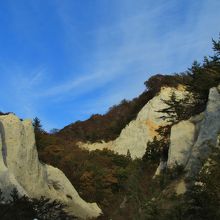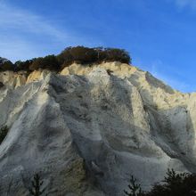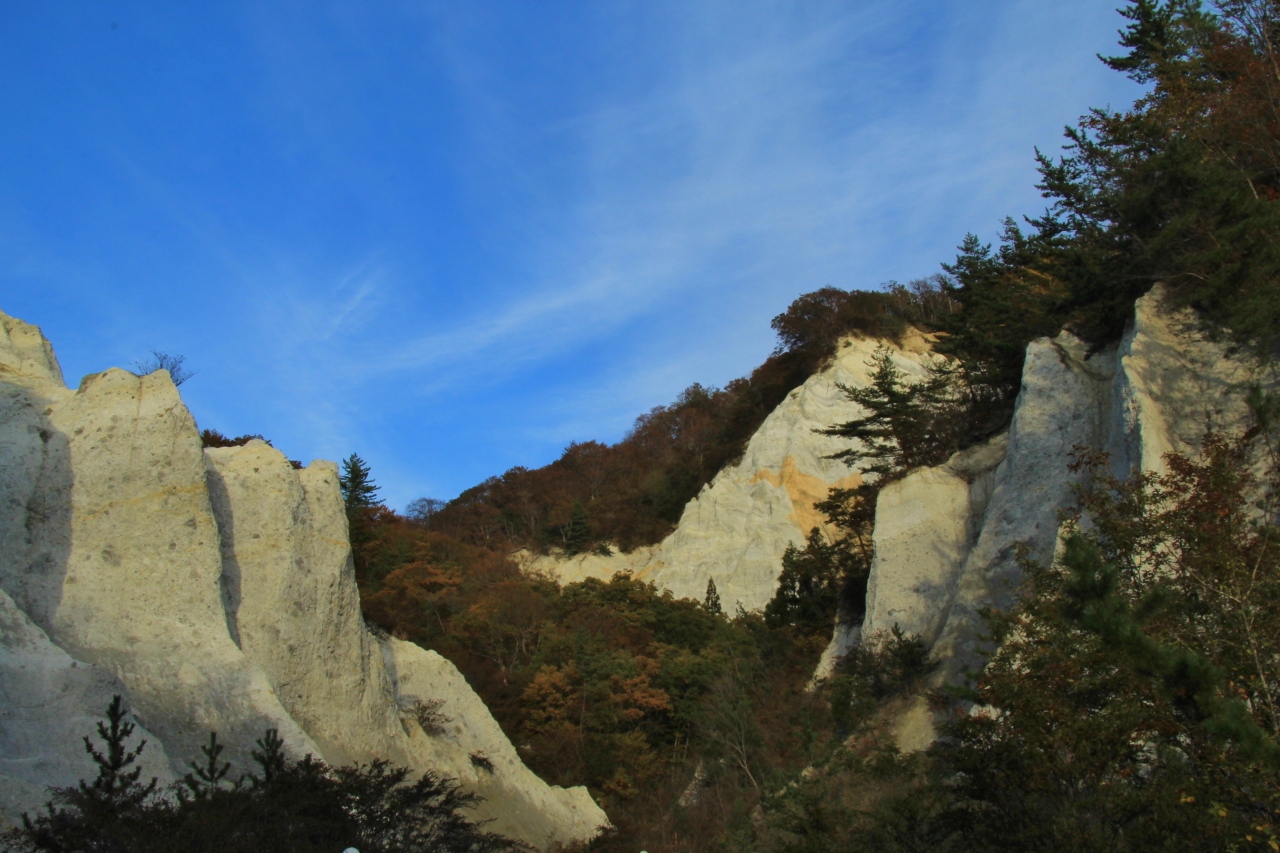 遠目で見ると大したことがないと思われますが、間近で見ると結構迫力のある景色です。浸食崩壊によって凝灰岩の白い岩肌がむき出しになったダイナミックなU字谷大断崖です。十二湖散策の最後に急な階段状の斜面を下りていくと目の前に断崖が迫っていました。